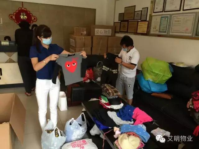将捐赠物品分类打包,经过两天的整理,共计收到书本4箱,玩具1箱,鞋1箱,书包1箱,衣服13箱。